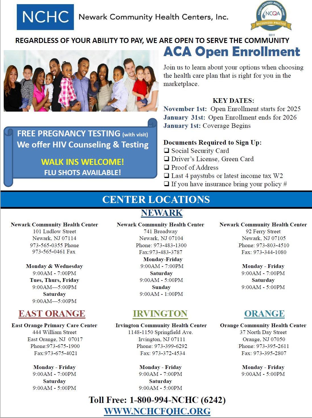 NCHC is a Federally Qualified Health Center. We offer a full range of medical and dental services for children, adults, and seniors including specialized support for diabetes, asthma, weight management, high cholesterol, and hypertension.
